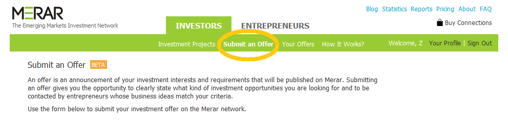 To publish such an announcement (or offer) investors need to log-in and go to the “Submit an Offer” page: